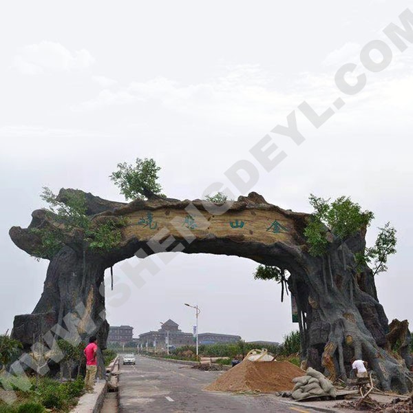 水泥仿真樹大門是仿真樹制作的較高境界,主要使用于公園景區、生態園入口、主題餐廳大門,農家樂等主題景觀的營造。水泥仿真樹大門同時借鑒了根雕工藝和雕塑工藝,仿真植物采用雕塑手法制作,仿真自然界中常見的植物造型,鑲嵌于大門景觀中,突出整體環境的格調。